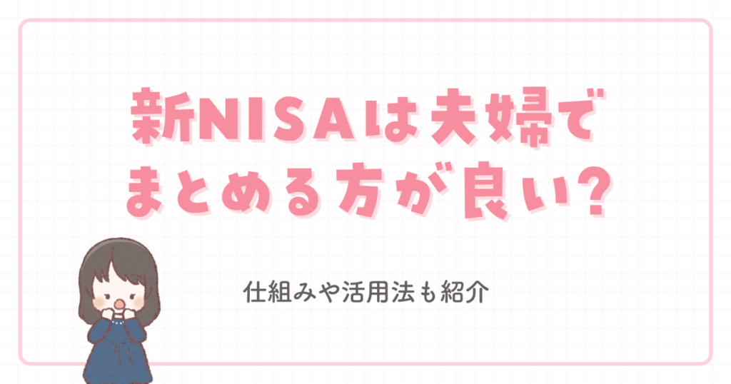 この記事では、新NISAを活用した資産形成のロードマップについて解説します。 新NISAって、今から始めても遅いんじゃない? 資産形成って難しそう…どうやって進めればいいのかな? 安心してください。資産形成は、ロードマップに沿って一歩ずつ進めれば、... 新NISA新NISAは夫婦でまとめる方が良い?メリットデメリットをわかりやすく解説