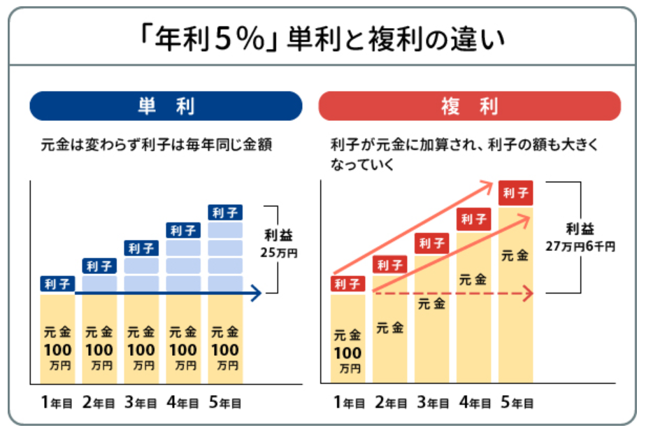 単利は元本に対してのみ利息がつき、複利は「利息が利息を生む」点が特徴です。